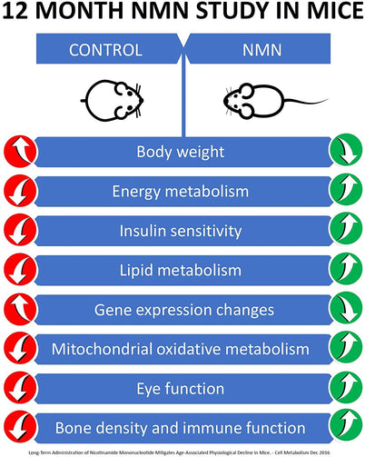 Studies in mouse models have shown that supplementation with NMN can increase lifespan, decrease and age-related frailty. This is likely due to NAD+ being a coenzyme for the sirtuin family of proteins, which can activate cellular repair pathways and which have shown to be involved in increasing lifespan and healthspan.